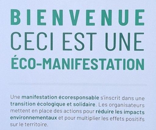 - Le public est informé de l’écoresponsablité de l’évènement via une bâche « Bienvenue ceci est une éco-manifestation »