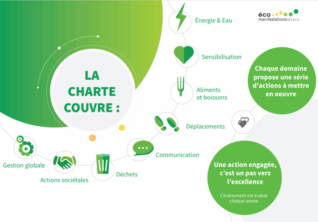 Pour accompagner les porteurs du projet dans son ambition d’écoresponsabilité, le choix s’est tourné vers Eco Manifestation d’Alsace (EMA), association implantée depuis 2011 en Alsace centrale et en pleine expansion : elle s’étend désormais aux territoires lorrains et champardennais voisins grâce au projet Eco-Manifestations Réseau Grand Est (EMeRGE). Spécialisée dans la valeur écologique des événements, Eco Manifestation d’Alsace guide les organisateurs — qu’ils soient porteurs de manifestations populaires (37 % en 2024), culturelles (28 %), professionnelles (20 %) ou sportives (14 %) — ainsi que les lieux accueillant du public (salles de spectacle, équipements sportifs, centres socioculturels…). Son approche, menant à décerner des labels écoresponsables, repose sur des conseils sur mesure et une charte d’engagement, permettant à chaque structure d’intégrer progressivement des pratiques durables. Les tarifs proposés par EMA sont calculés en fonction de l’enveloppe de l’événement et exonérés de TVA.