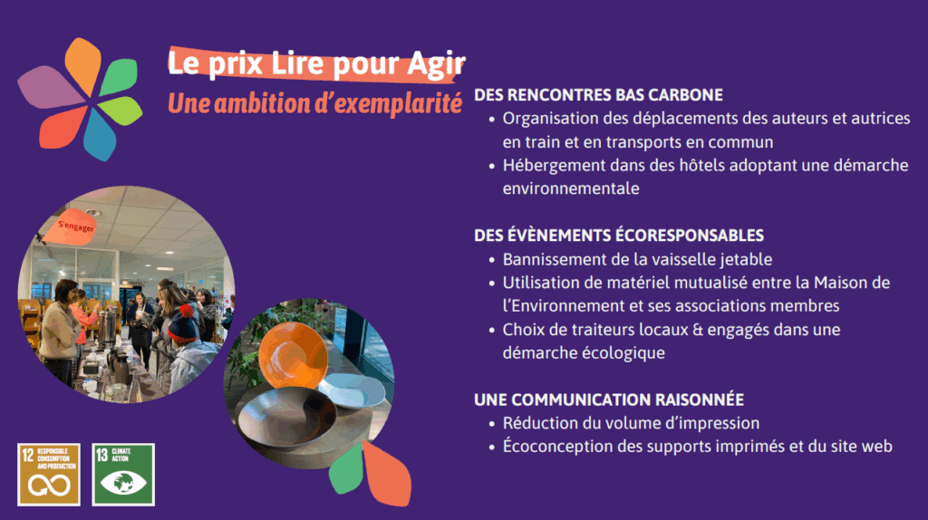 Il convient de noter également la gestion éco-responsable de l’événement, mise en avant par la Maison de l’environnement dans son dossier de candidature au Green Library Award, dont voici l’extrait correspondant :